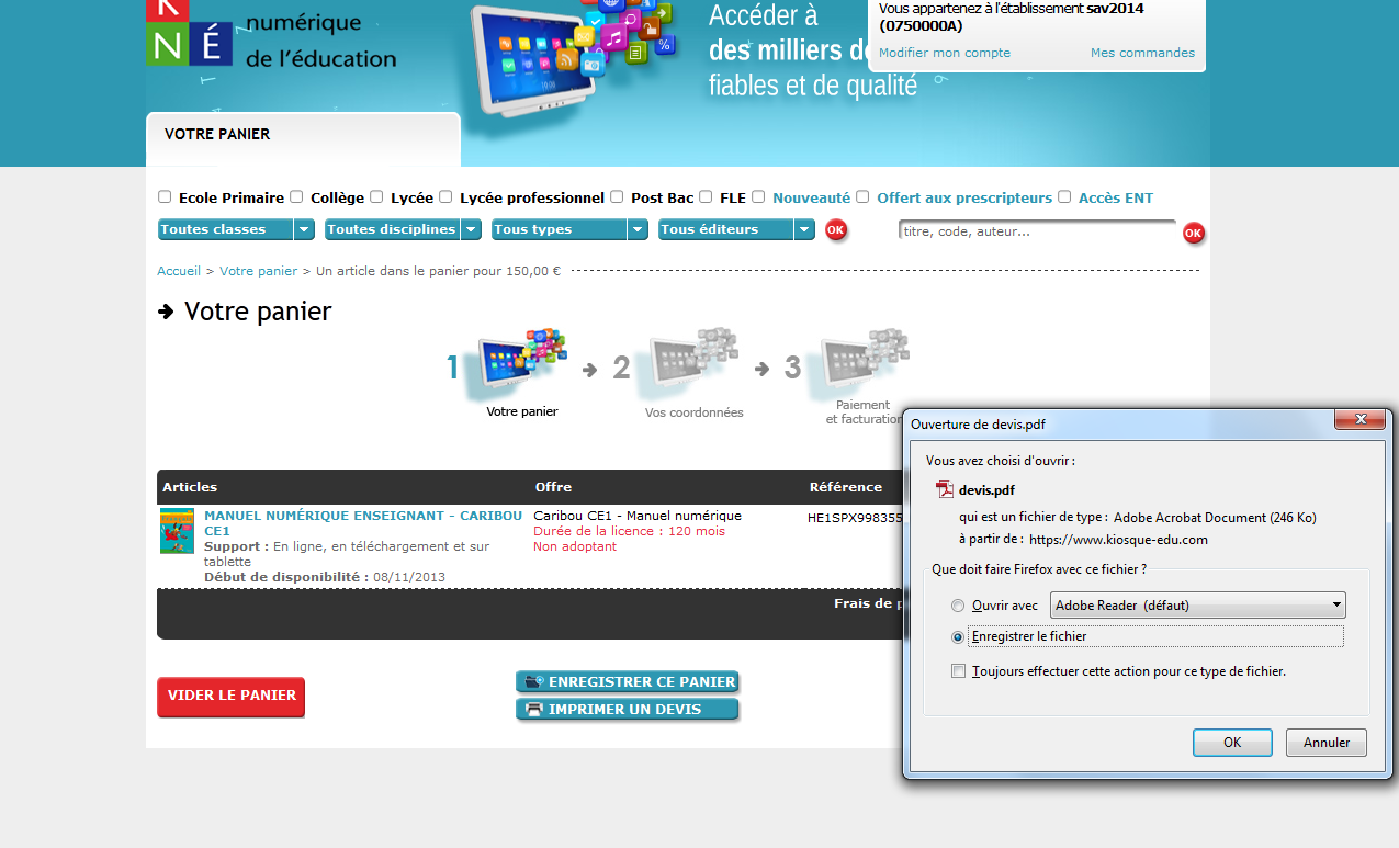 cliquez sur le bouton "Voir" afin d'afficher votre panier. Vous avez à votre disposition le bouton "Imprimer un devis", qui génère votre devis au format pdf :